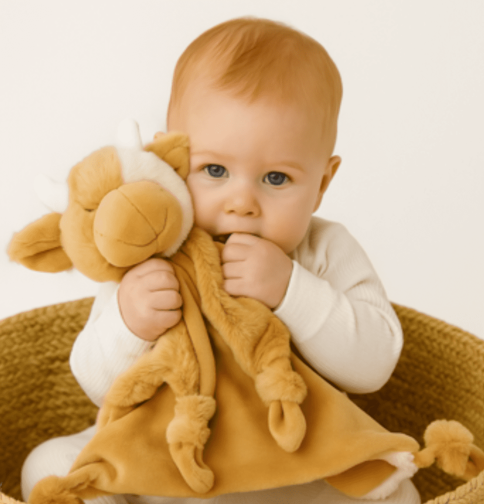 Daisey is a sweet little cow with soft brown-and-white patches and the warmest, most huggable body. With her gentle nature and playful charm, she’s always ready to bring comfort and smiles, whether it’s pram rides, picnics in the paddock, or cosy bedtime snuggles. A touch of farmyard whimsy, and a whole lot of love, wherever she goes.