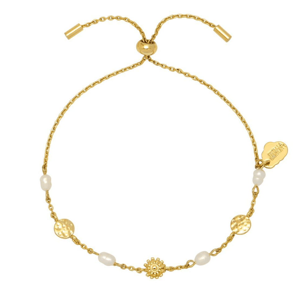 Let your dreams blossom with our gold-plated Textured Disc Flower Pearl Bracelet. Featuring a dainty chain with a series of textured disc charms, flowers and pearls, as well as an adjustable slider, this bracelet is the perfect everyday piece.