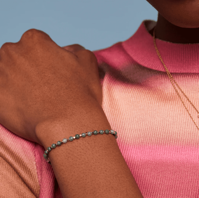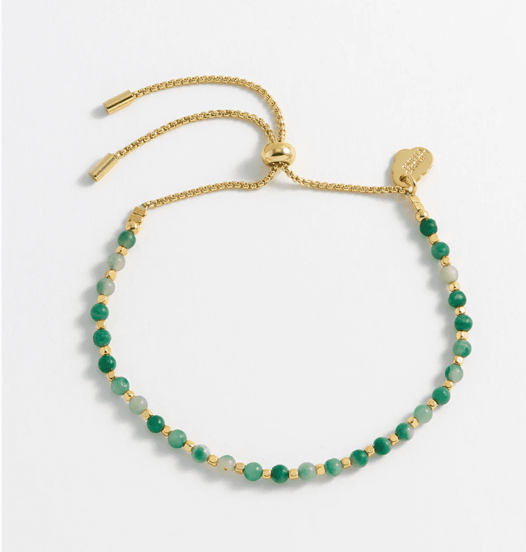 Our classic Amelia bracelet is dotted with green quartz and gold plated beads with a slider fastening, making it suitable for any wrist size. Green Quartz is thought to help turn negative energy into positive energy and help with whole body cleansing. The slider fastening means it will be suitable for any wrist size!