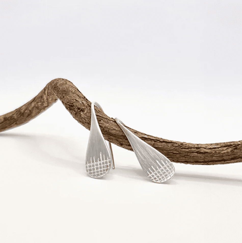 Fondly known as our ‘spoon’ earrings, these long teardrop hook earrings hang as a full front feature. These spoons feature a fine grid-line pattern work at their base – a lovely match with our Nk111 ‘Heart Grid Necklace”. Made from sterling silver with matte finish.