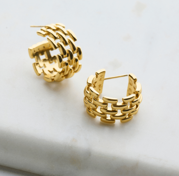 The Rosie Hoops are bold yet elegant large hoop earrings featuring a distinctive chain-like design. Their unique texture adds a modern edge, making them the perfect statement piece for any occasion. Lightweight and effortlessly stylish, these hoops are designed to elevate your everyday look while pairing beautifully with the Rosie Bracelet for a coordinated finish.