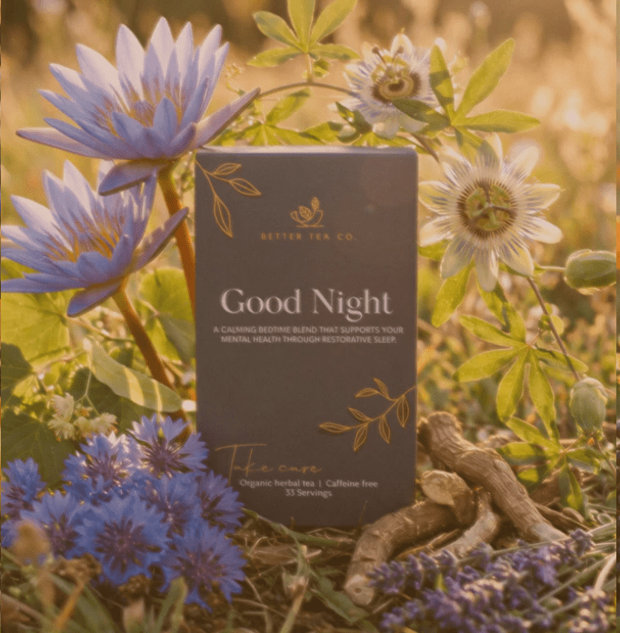 Good Night Tea is your gentle nudge toward stillness. A calming herbal blend that soothes your nervous system, softens tension, and helps you drift off naturally – without grogginess the next day.
