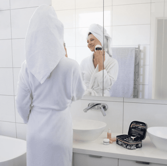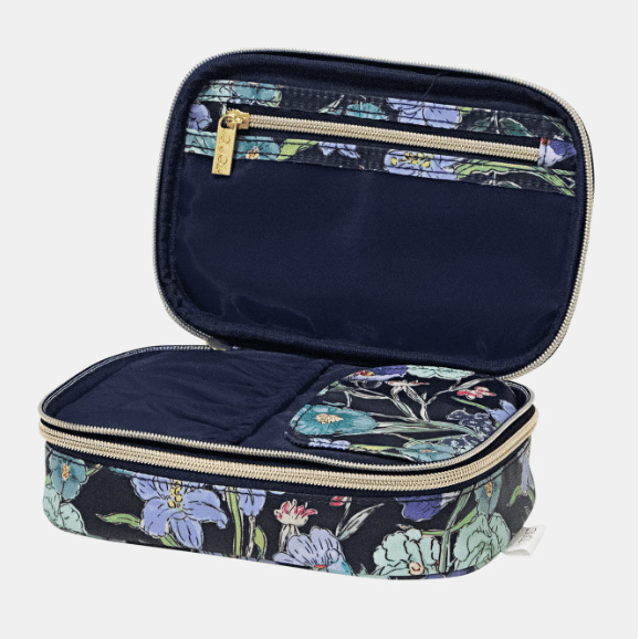 Designed for the beauty lover, the Makeup Organiser is the ideal storage solution to keep your cosmetics and makeup tools together. Featuring two compartments, the top section has elasticised pockets for makeup brushes complete with a flap section to protect them when storing or travelling while the zipped mesh pocket in the lid is perfect for storing sponges and other flat items. The base compartment is roomy enough for all your beauty needs. Crafted with sustainable cotton coated with PVC for easy care, this makeup organiser features the delightful Fleur Ink print with a recycled polyester lining in coordinating navy.