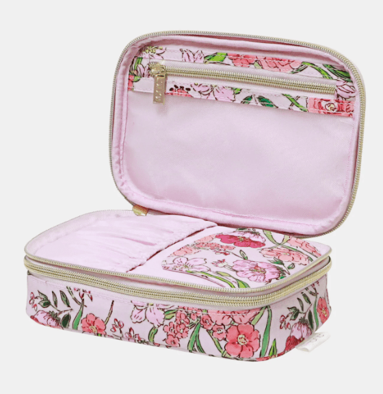 Crafted with sustainable cotton coated with PVC for easy care, this Makeup Organiser features the pretty Fleur Rose print with a recycled polyester lining in coordinating soft pink. Thoughfully designed for the beauty lover, this cosmetic bag is the ideal storage solution to keep your makeup and tools together. Featuring two compartments, the top section has elasticised pockets for makeup brushes complete with a flap section to protect them when storing or travelling while the zipped mesh pocket in the lid is perfect for storing sponges and other flat items. The base compartment is roomy enough for all your beauty products.
