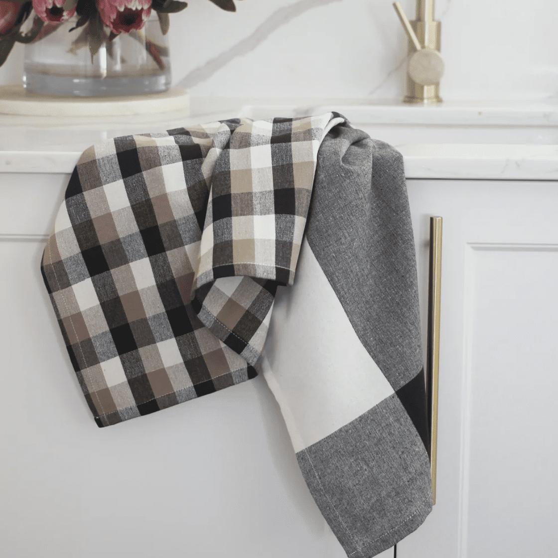 Set of 2 woven cotton tea towels. One in giant check, the other small check in mustard, black or olive taupe & 1/2 white.