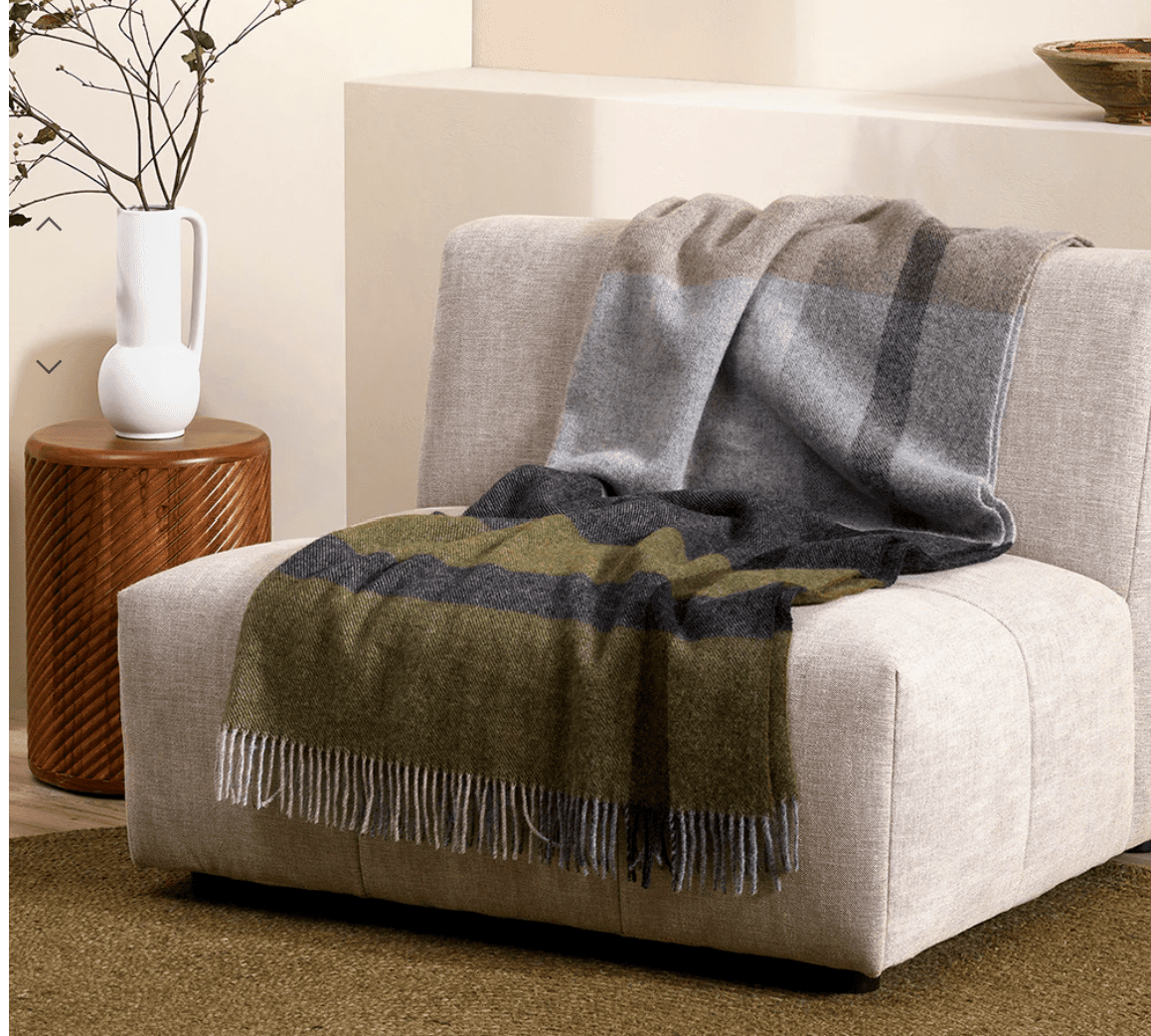 pure wool throw. Crafted from New Zealand grown wool, the timeless design and rich olive tones
